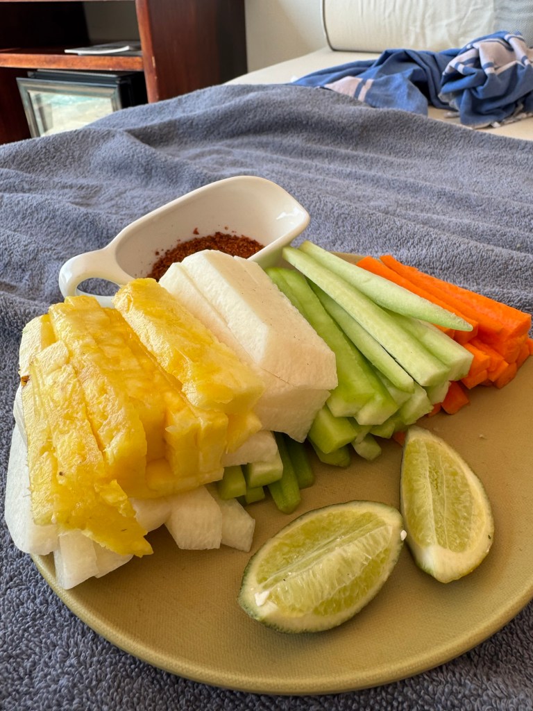 Friday night, we kept it simple and ordered room service—because nothing says vacation like eating in bed after a travel day.