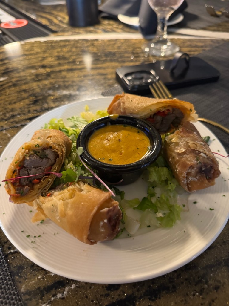 Boerewors Sausage – This is a South African-style sausage, sliced and served with a spicy chakalaka sauce. It was packed with flavor and had just enough heat. Beef Rolls – Think crispy, golden-fried rolls stuffed with beef, peppers, and onions, served with a buttery scampi sauce. So good.