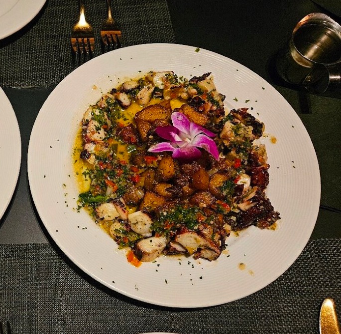 We shared a small Caesar salad, which had peppadews tossed in for a little sweet heat twist. And then the star of the show: the chargrilled octopus. It was sous vide and then grilled, topped with chimichurri. Super tender and full of flavor—definitely a standout.